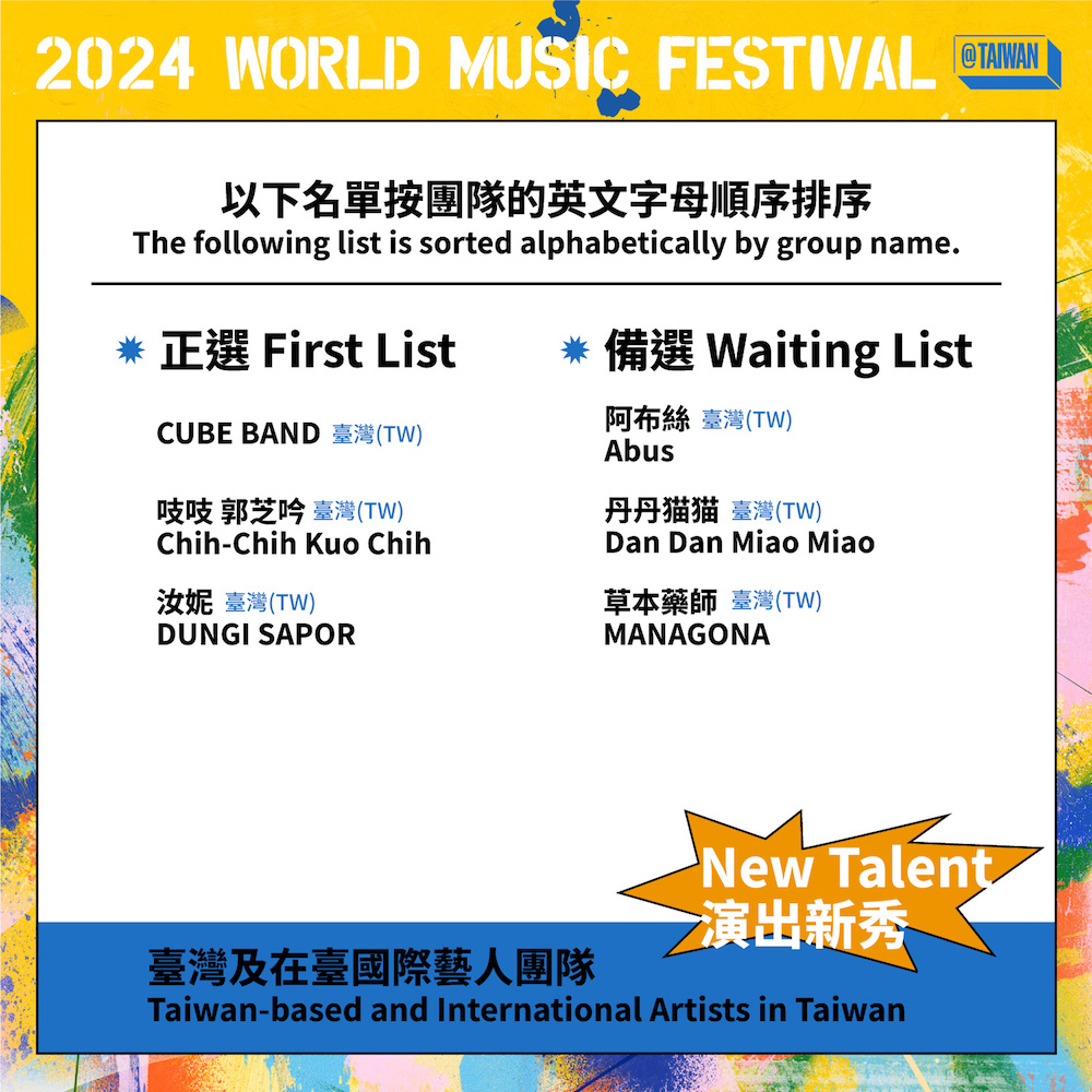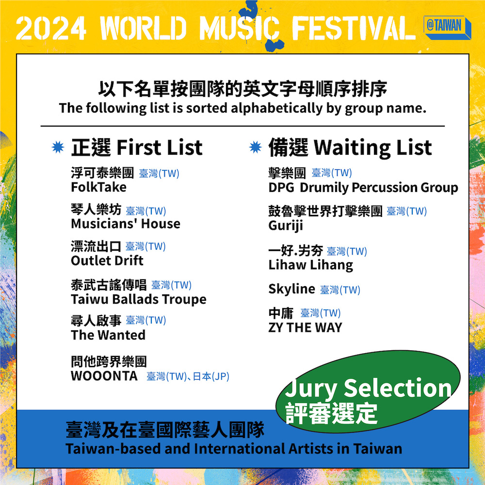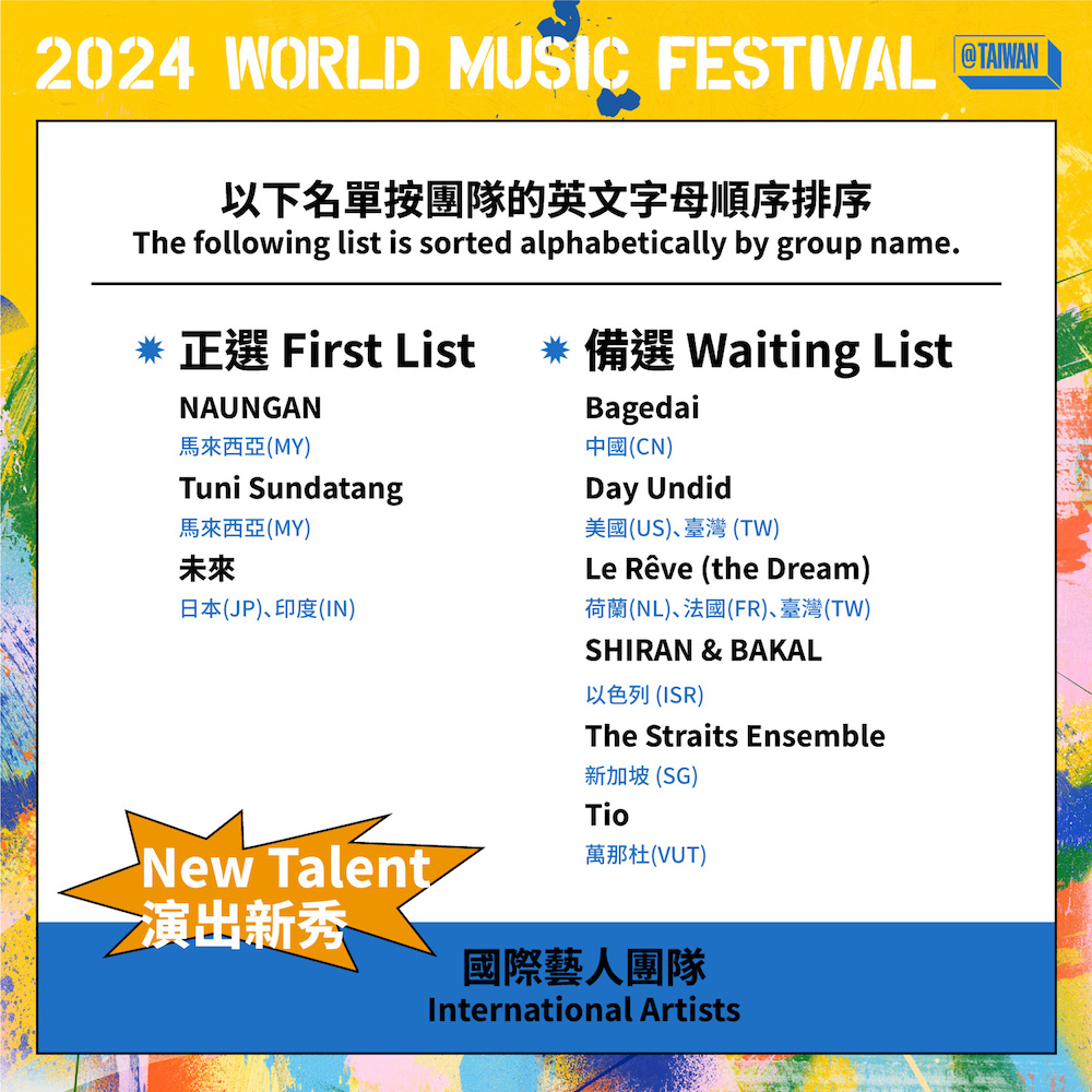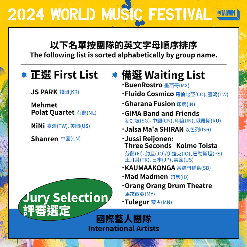「2024 世界音樂節@臺灣」將於今年 10/11~13 在臺北流行音樂中心盛大登場。首波公開陣容包含來自布里亞特的 NAMGAR、日本的 Minyo Crusaders 兩組各大國際音樂節的演出常客;還有「金曲歌王」乱彈阿翔與「跨域創作團體」异境樂團帶來限定特別演出,「熱帶浪漫男子」雷擎也將帶來充滿地球音樂風情的魅力表演。此外,由 169 組報名者中脫穎而出的 16 組國內外演出團隊將於 Showcase 輪番上陣。活動早鳥票已於 7/3 正式啟售,邀請聽眾共同拓展全球特色音樂的新視野!