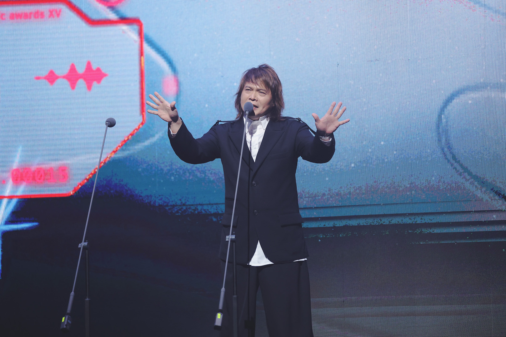 本屆頒獎典禮由演藝圈新生代才子黃豪平扛下主持棒,曾五次接任金鐘紅毯主持的他兼具喜劇演員身分,說學逗唱功力不在話下,這次為了金音 15 使盡十八般武藝,除了把擅長的脫口秀融入典禮主持中,更巧扮加拿大聲樂老師 Rozette 驚喜開場,透過模仿的角色傳達了「網路無國界、音樂無國界」的代表意涵!原來這位聲樂老師 Rozette 前陣子因為精闢點評各個大咖天王天后的舞台表演及唱腔,而讓全網膜拜,黃豪平特別抓準娛樂時事來模仿她作為開場主持「分身」,透過她獨特的聲音、表情、動作,一一將各個入圍者唱名點評。