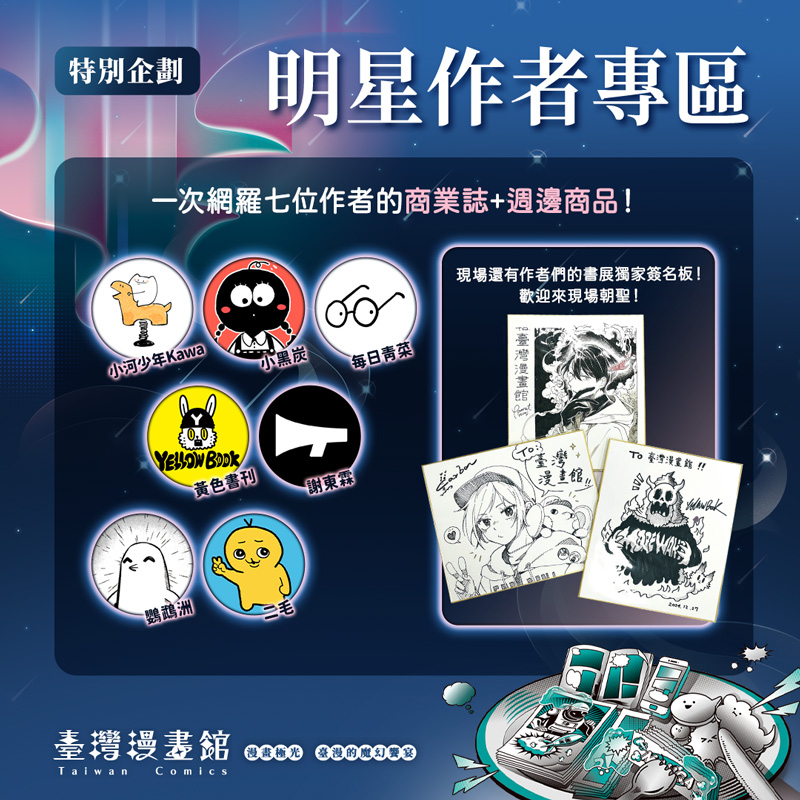 而與金石堂書店合作的銷售區則集結了上百款臺漫實體書籍與周邊商品,邀請大家前來挖寶、選購。其中在「作者專區」更特別展出七位明星漫畫家的親繪簽名板,絕對是漫迷們的必訪打卡亮點,而剛接觸臺漫的讀者則可以參考「名人推薦」的短句小卡,總會遇上一本讓你愛不釋手的作品。