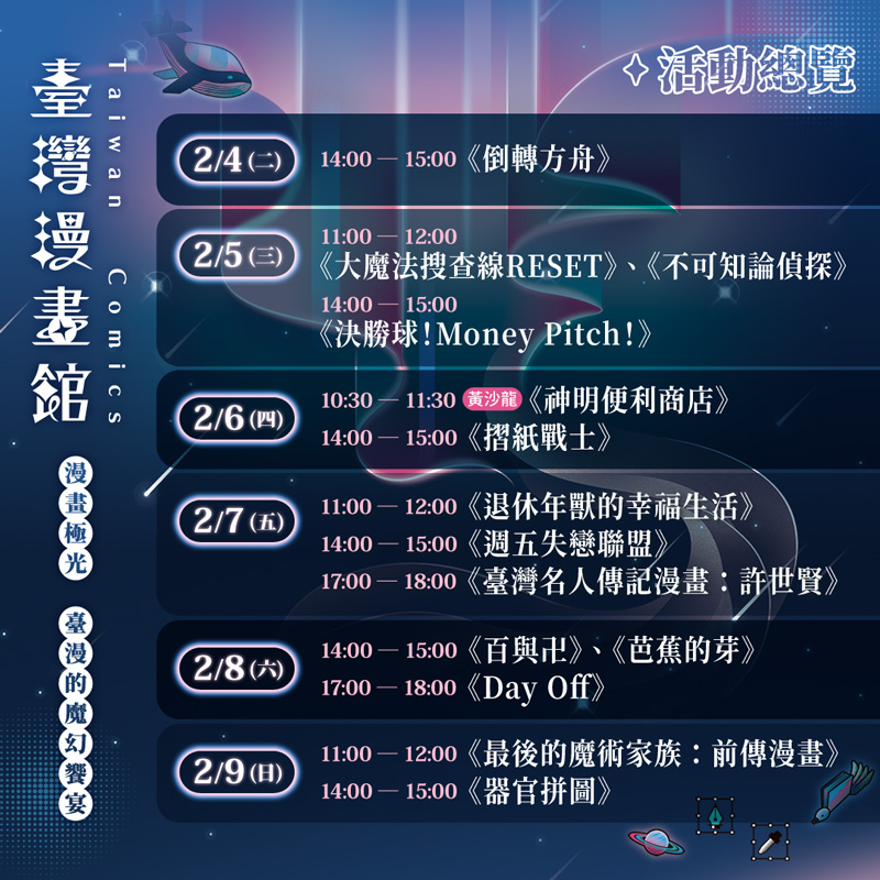 臺漫館將在書展帶來共 12 場精彩活動:超人氣漫畫家謝東霖將參與大會沙龍,分享《神明便利商店》如何開放「加盟」,從漫畫原作跨域改編成手遊、玩具、影集等不同形式,此次將聯同艾肯集團代表楊翹瑄解鎖他們共同合作的新計畫。