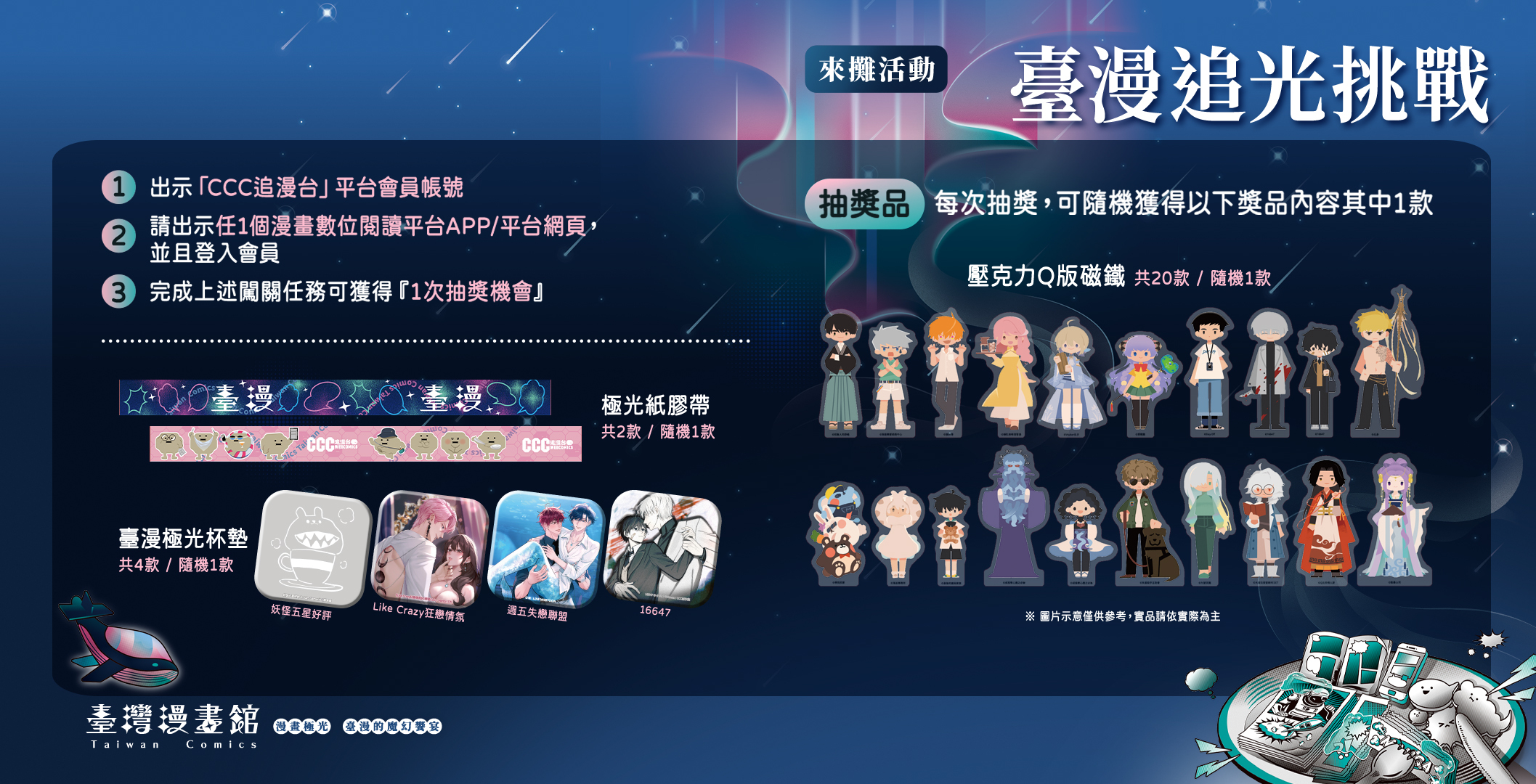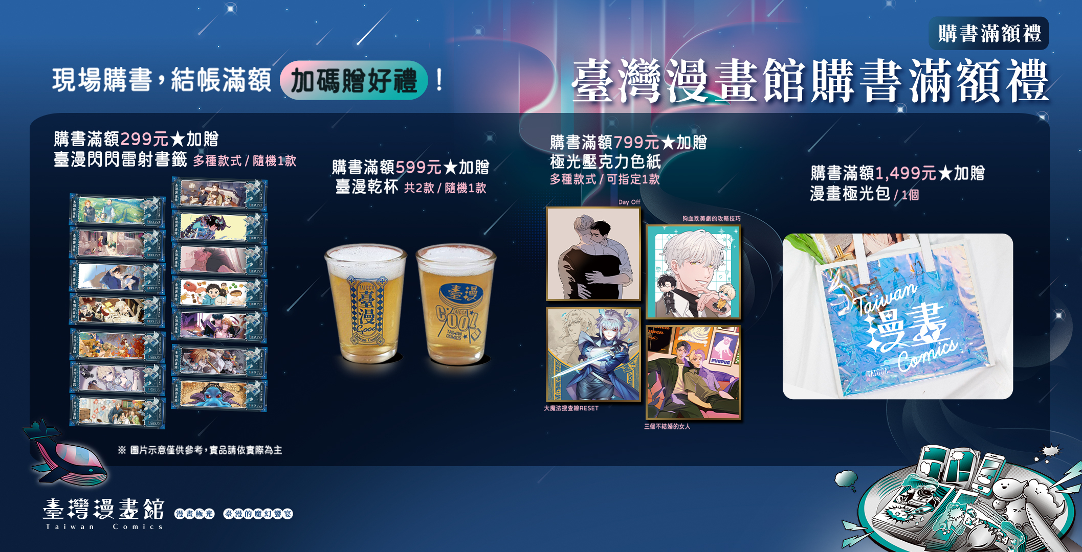 為回饋讀者們的支持,臺漫館也準備了多項好禮:消費滿指定金額即加碼送臺漫乾杯、極光壓克力色紙及漫畫極光包。完成闖關活動的小任務,還有機會把臺漫追星卡、Q 版磁鐵、紙膠帶、光釉杯墊等精美周邊帶回家。「臺灣漫畫館」位於書展的動漫輕小說專區,攤位號碼為 C212,歡迎民眾前來享受一席臺漫的魔幻饗宴。